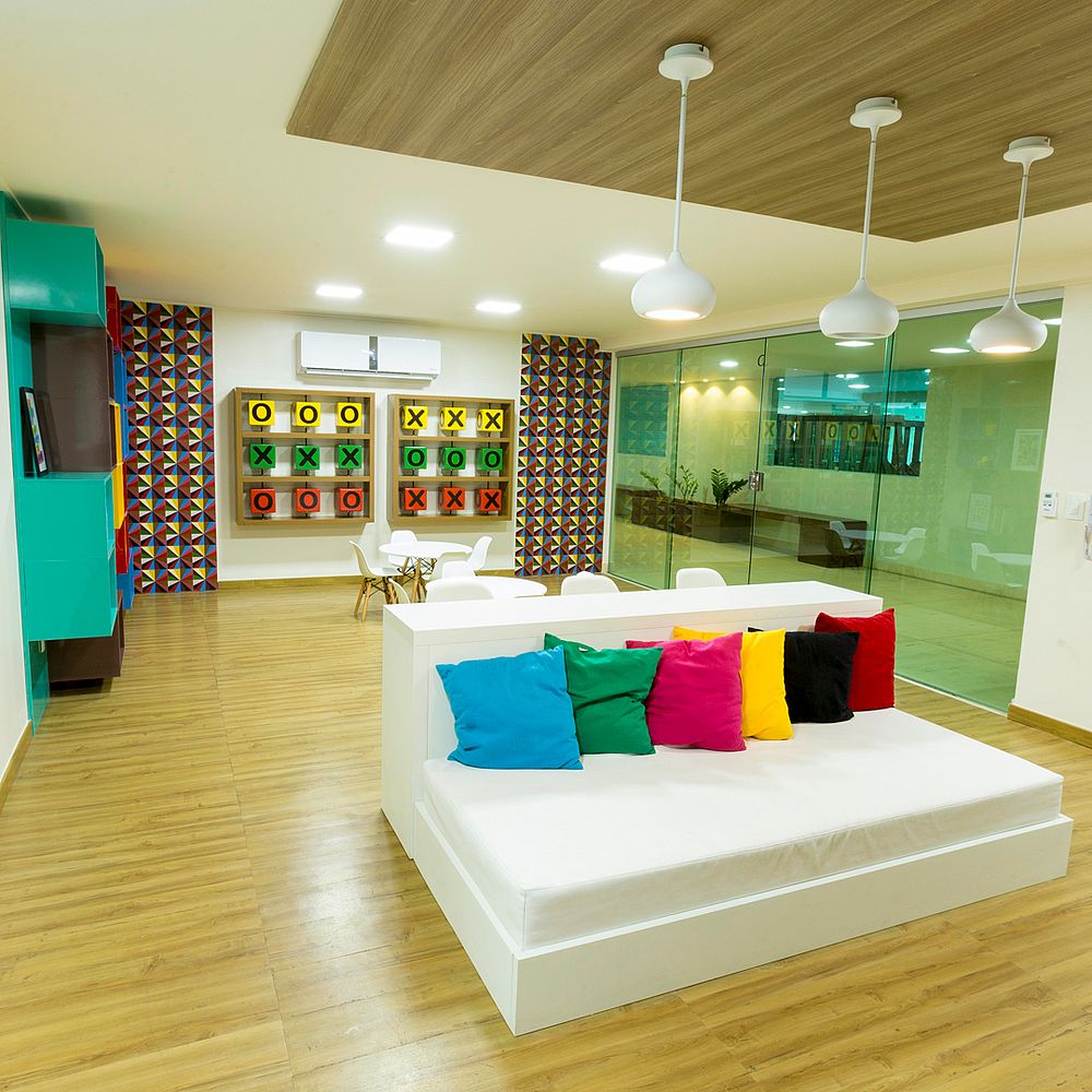 Brinquedoteca no pilotis e Salão de jogos na cobertura impressionam pelo acabamento e bom gosto da decoração |