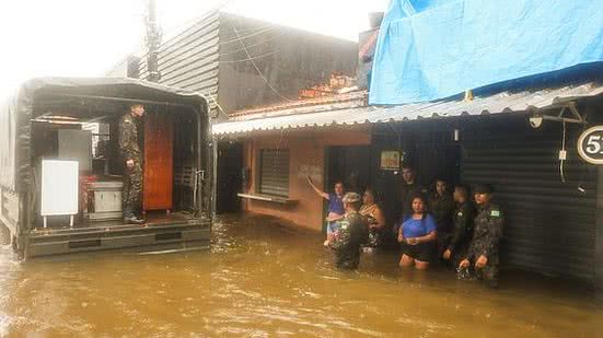 A Defesa Civil se reveza em três turnos para fazer o transporte das famílias atingidas para os abrigos da cidade, com apoio do Exército e Marinha.