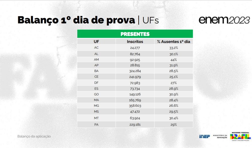 Ainda segundo o balanço parcial apresentado pelo Inep, 71,9% dos candidatos participaram do primeiro dia de provas, nesse último domingo, em todo o Brasil. A porcentagem de abstenção nacional ficou em 28,1%.