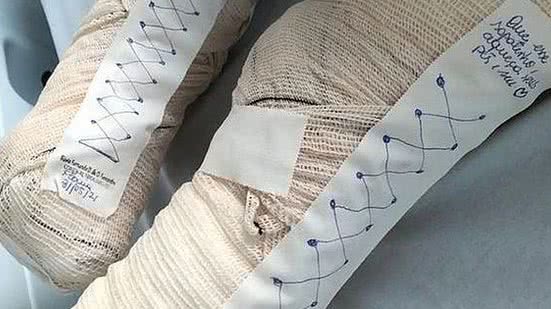A enfermeira Flávia Fernanda trabalha na ala de pacientes internados com Covid-19 do Hospital da Mulher. Como uma forma de demonstração de afeto, ela resolveu desenhar uma espécie de sapato nos pés envoltos por uma atadura, com direito a cadarços e a seguinte mensagem: "que esse sapatinho aqueça seus pés e seu coração".