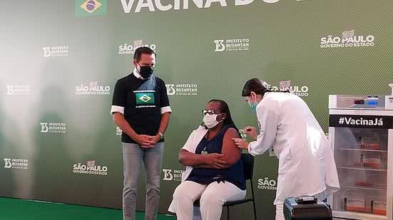Após ser imunizada, ela recebeu do governador João Doria (PSDB) um selo simbólico com os dizeres “Estou vacinado pelo Butantan” e uma pulseira com a frase “Eu me vacinei”.