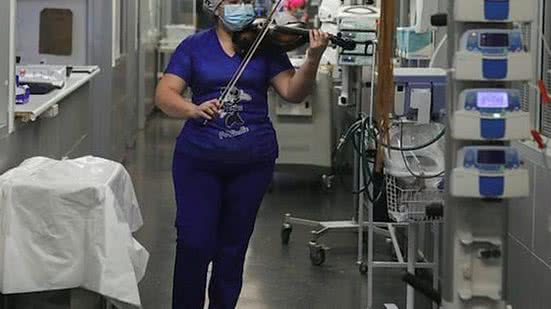 Uma enfermeira, que trabalha na linha de frente da pandemia de coronavírus, fica no hospital após o turno só pra tocar para os pacientes doentes e funcionários exaustos, como ela.