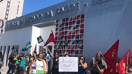 Colegas de trabalho da enfermeira Ruge Correia se reuniram em frente à sede da Secretaria Estadual de Saúde do Estado (Sesau), nesta quinta-feira (31), em protesto pelo afastamento da profissional de saúde.