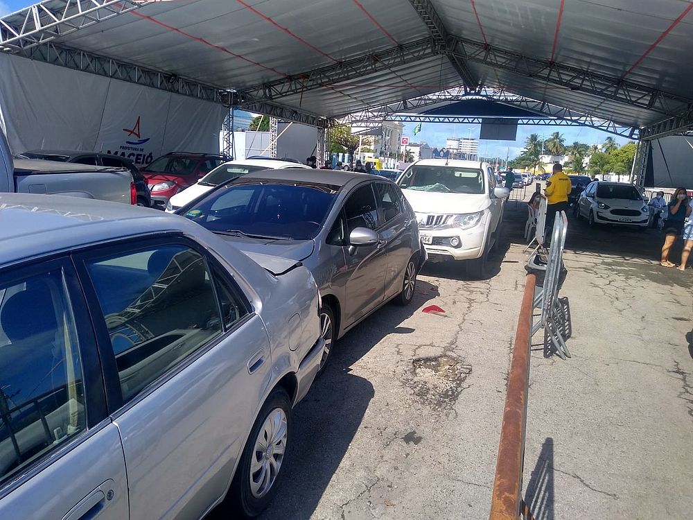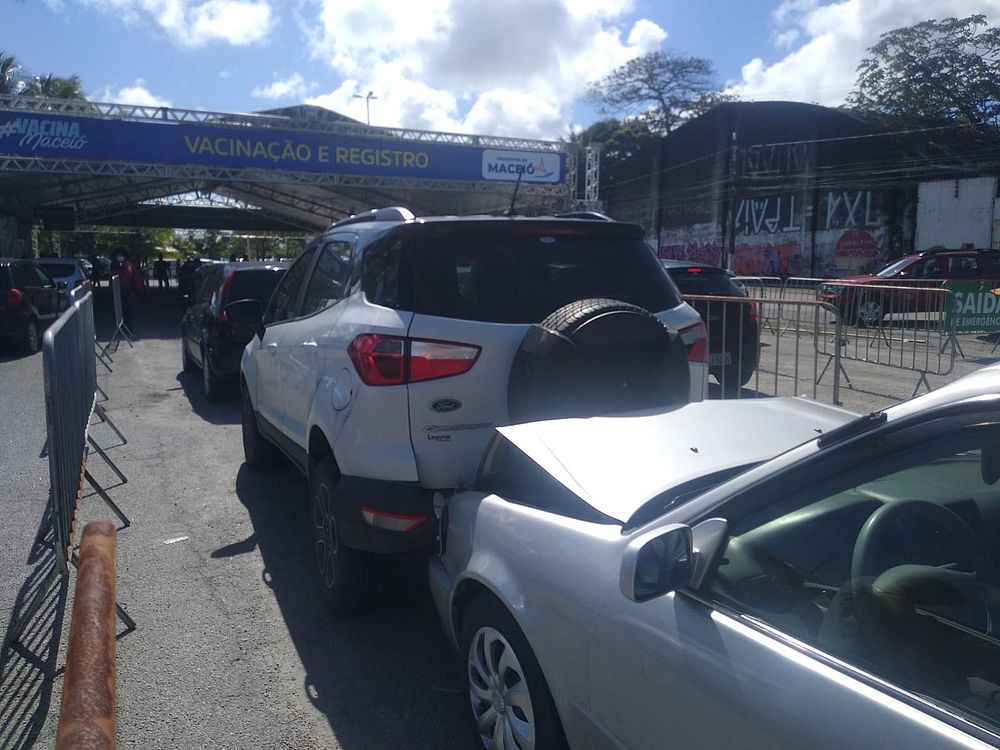 Uma das filas da vacinação no drive-thru do Jaraguá, em Maceió, foi interrompida após um engavetamento envolvendo quatro carros, nesta quinta-feira (12). Apesar do susto e dos transtornos, não houve pessoas feridas.