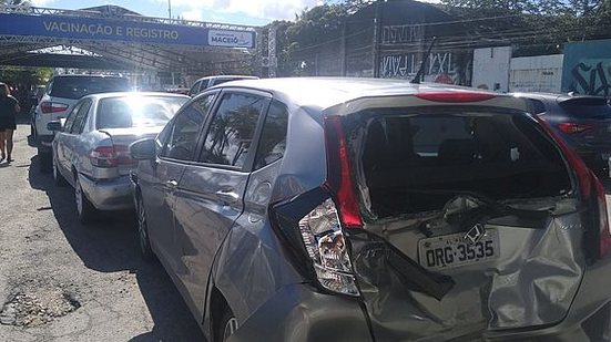 Uma das filas da vacinação no drive-thru do Jaraguá, em Maceió, foi interrompida após um engavetamento envolvendo quatro carros, nesta quinta-feira (12). Apesar do susto e dos transtornos, não houve pessoas feridas.