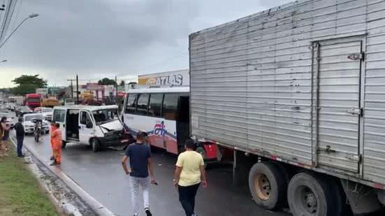 O engavetamento que envolveu caminhão, micro-ônibus e van deixou ao menos uma pessoa ferida e o trânsito travado na Avenida Menino Marcelo, em Serraria, na manhã desta terça-feira (1º).