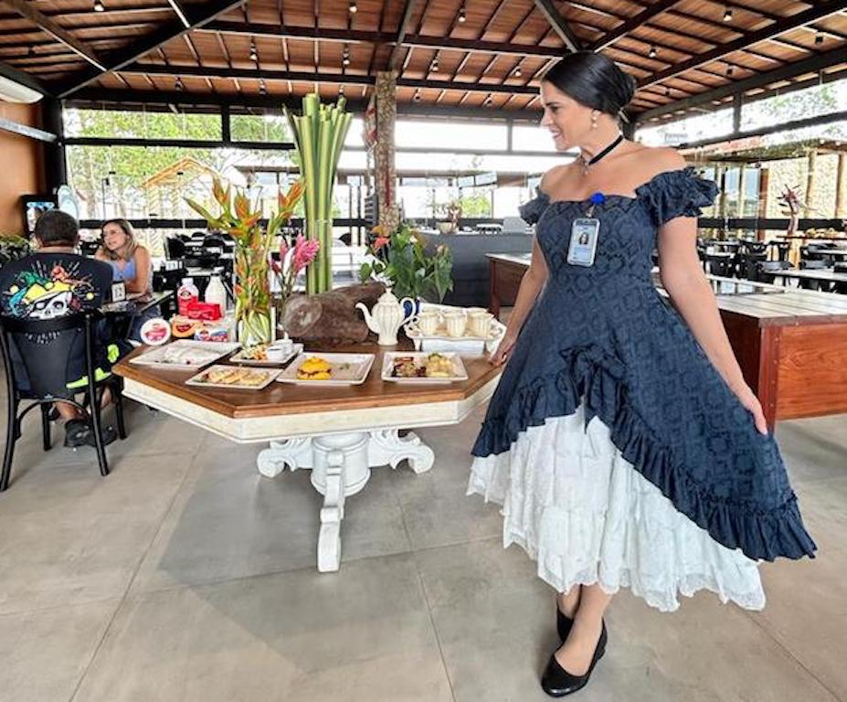 Guia Fabricia vestida de Sinhá Moça na visita técnica ao Engenho do Queijo