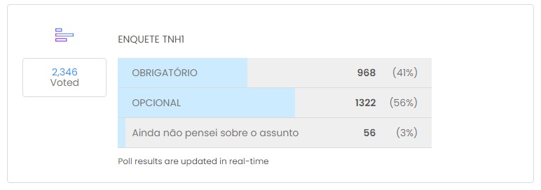Foram registrados 2.346 votos, sendo 1.322 (56%) para a escolha de que a vacinação deve ser opcional; 968 internautas acham que a vacina deve ser obrigatória, o que resultou em 41%; já a opção dos que ainda não sabem sobre o assunto ficou com 3% na pesquisa, equivalente a 56 votos. Os números foram fechados para esta matéria exatamente às 8h24 deste sábado, 19.