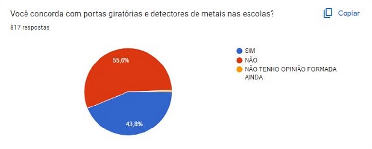 A maioria dos internautas do TNH1 votou contra a ideia de instalar portas giratórias e detectores de metais nas instituições de ensino público e privado de Maceió. Em enquete realizada nesta sexta-feira (26), 55,6% não concordam com a proposta, enquanto 43,8% são a favor e 0,6% não tem opinião formada sobre o tema.
