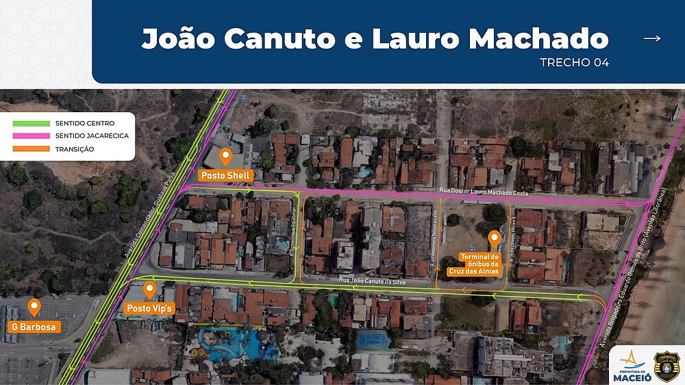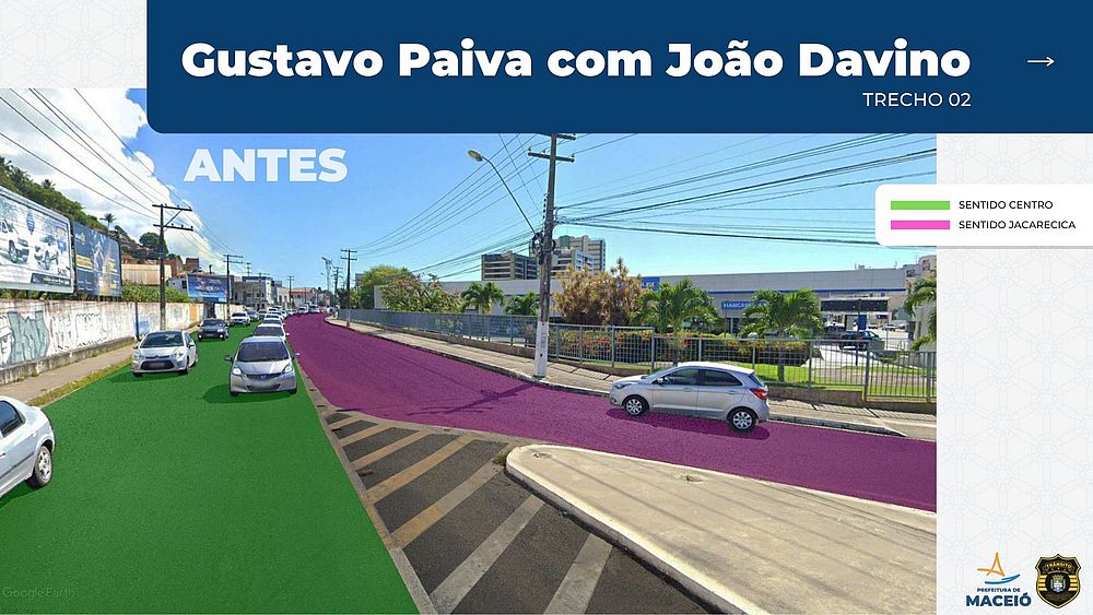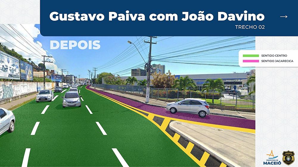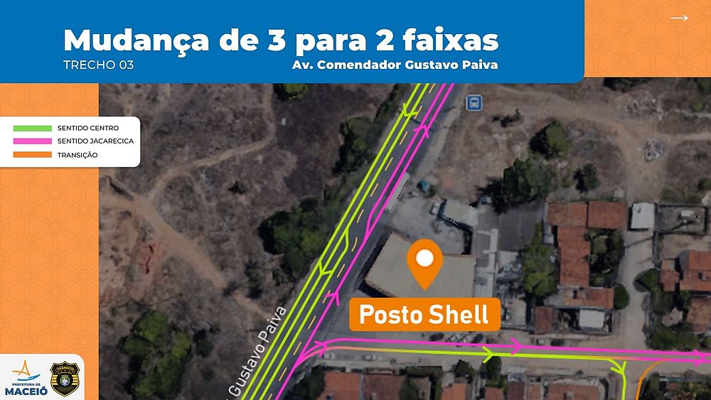 Já na Avenida Comendador Gustavo Paiva, no trajeto que vai desde o Posto Shell/Mar Azul até a Avenida João Davino, das quatro faixas que existem na via, três funcionarão exclusivamente no sentido Centro. A última faixa irá operar em esquema de contrafluxo, prioritariamente, para a circulação do transporte público, mas poderá ser acessada por outros veículos para acessar estabelecimentos comerciais, escolas e demais empreendimentos que estão ao longo da via.
