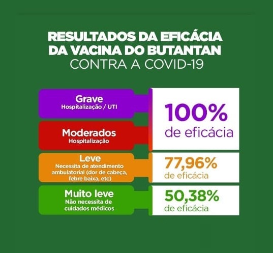 Segundo o Instituto, a eficácia geral é de 50,38%, considerando casos muito leves (um ou mais sintomas, por no mínimo dois dias, e que não demandem atendimento médico).