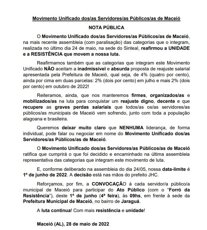 Em carta aberta, o Movimento Unificado dos Servidores Públicos de Maceió classificou a proposta da Prefeitura de Maceió como "inadmissível" e "absurda".