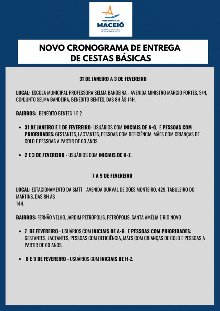 O calendário de entrega das cestas básicas no bairro do Benedito Bentes será iniciado na próxima segunda-feira (31). A ação , que segue até 3 de fevereiro, ocorre na Escola Municipal Professora Selma Bandeira, localizada na Avenida Ministro Márcio Fortes, S/N, Conjunto Selma Bandeira, das 8h às 14h.