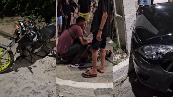 O motociclista ficou deitado na calçada, sendo assistido por populares enquanto aguardava o socorro médico. Ele estava consciente, sem fratura visível, mas alegou dores devido à pancada. O carro envolvido, de cor preta, ainda acertou o poste e apresentou danos na parte frontal.