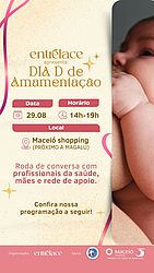 O mês de agosto, conhecido como Agosto Dourado, é marcado por uma série de iniciativas globais que promovem o aleitamento materno. E para finalizar esse mês tão importante, a Entrelace e o Maceió Shopping têm o prazer de apresentar um evento especial para destacar e reforçar a importância da amamentação, no dia 29 de agosto, no Maceió Shopping, das 14h às 19h.