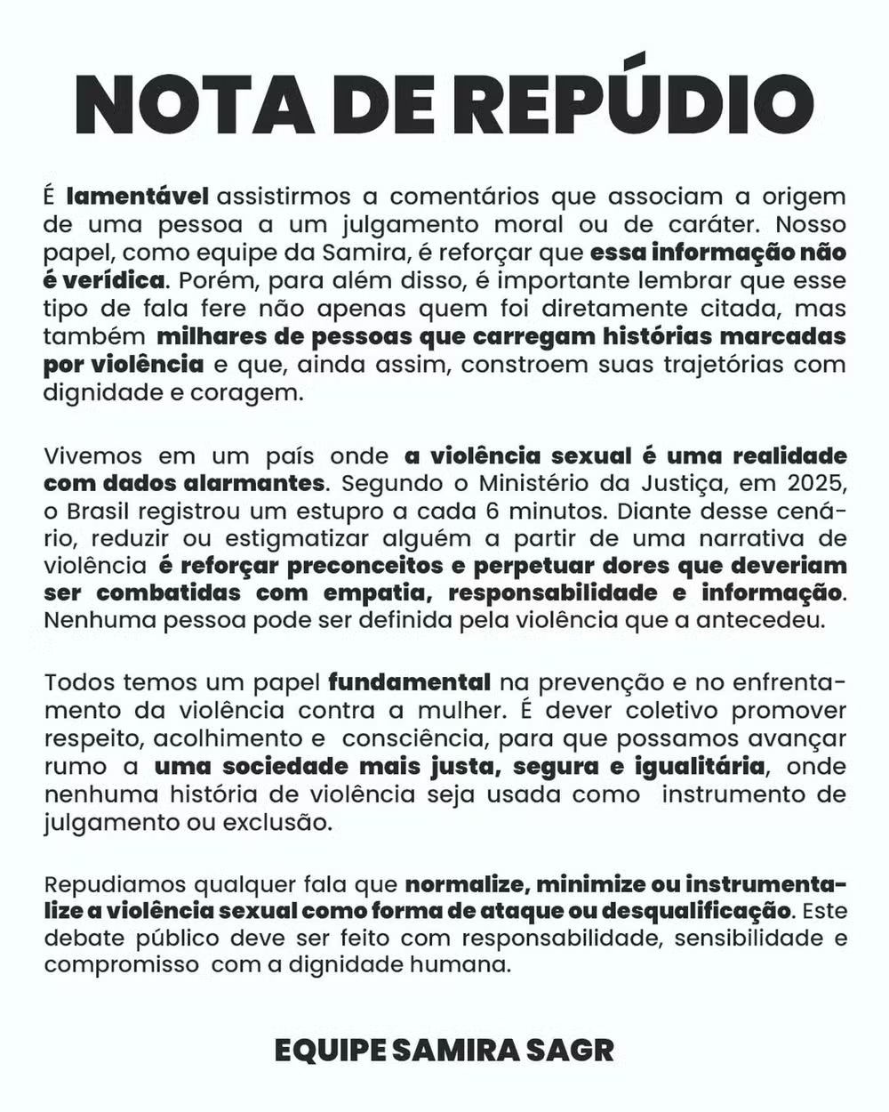 "Vivemos em um país onde a violência sexual é uma realidade com dados alarmantes. Segundo o Ministério da Justiça, em 2025, o Brasil registrou um estupro a cada 6 minutos. Diante desse cenário, reduzir ou estigmatizar alguém a partir de uma narrativa de violência é reforçar preconceitos e perpetuar dores que deveriam ser combatidas com empatia, responsabilidade e informação", continua.