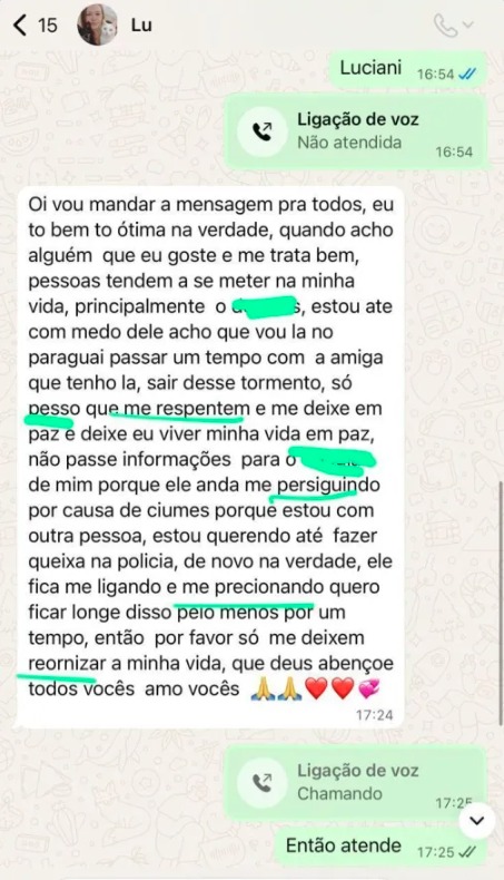 Segundo o irmão de Luciani, Matheus Estivalet Freitas, foram enviadas mensagens com erros de português pelo celular da corretora, depois que a família passou um tempo sem conseguir qualquer comunicação com ela.