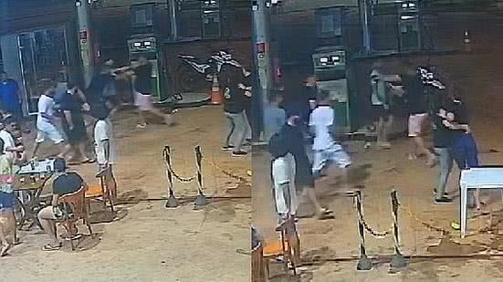 O segurança ainda caminha pelo posto, enquanto as outras pessoas tentam ficar longe dele. Ele observa a movimentação da vítima, mas depois é abordado por um homem que tenta acalmá-lo. A polícia destacou que o influenciador estava presente na bebedeira, mas não foi atingido.
