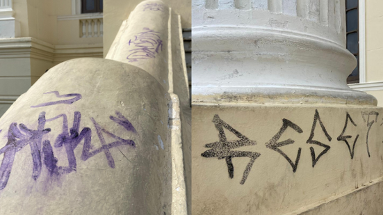 A escadaria da Associação Comercial de Maceió foi vandalizada com pichações na madrugada de sábado, impactando a imagem do patrimônio cultural local e coincidentemente antes do evento Natal no Jaraguá, que atrai público para a região.