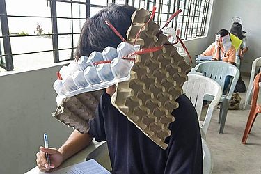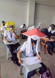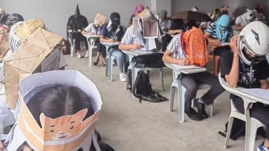 Instituições de ensino nas Filipinas encontraram uma forma inusitada de evitar que seus alunos trapaceiem e copiem as respostas de colegas nas provas. São os chamados "chapéus anti-cola", que viralizaram nas redes sociais do país depois que alunos de uma universidade em Legazpi, ao sul de Manila, adotaram os acessórios ao prestar seus exames de meio de período, conta a BBC.