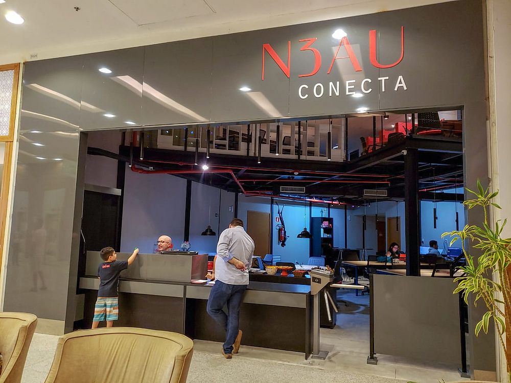 Ambas são sócias no escritório N3AU, especializado em Arquitetura Corporativa. Batizado de N3AU Conecta, o coworking fica na praça de alimentação do shopping e acomoda mais de 60 pessoas simultaneamente.