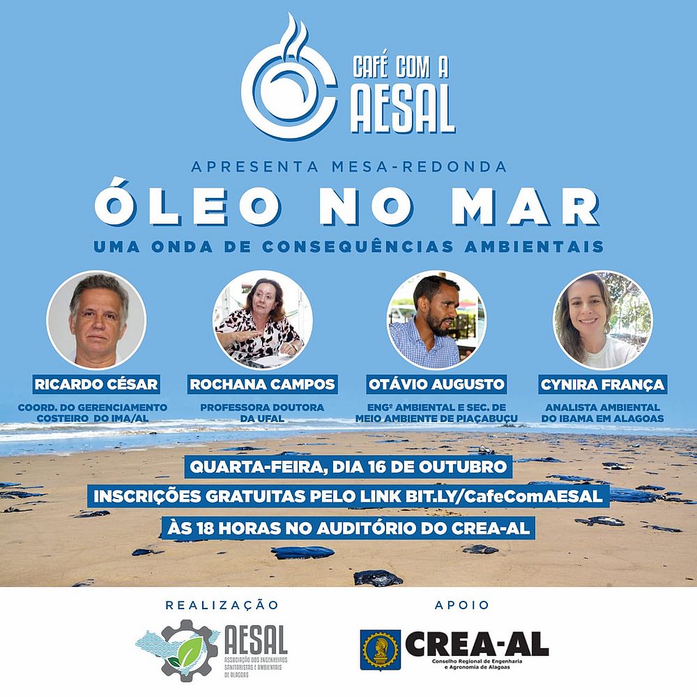 "A mesa redonda é uma proposta do projeto 'Café com a AESAL', que foi criado para colocar em discussão temas de interesse da sociedade e que podemos contribuir do ponto de vista profissional. Pontualmente realizaremos o projeto com assuntos em pauta. Este é um evento aberto a toda a população e vamos reunir profissionais gabaritados de Alagoas que têm atuado diretamente no diagnóstico do surgimento das manchas nas praias, na produção de relatórios e também na orientação em relação à adoção de medidas futuras. A mesa tem como tema 'Óleo no mar: uma onda de consequências ambientais' e contará com nomes do IMA/AL, do IBAMA e da UFAL", explica a presidente da AESAL, Liz Araújo.