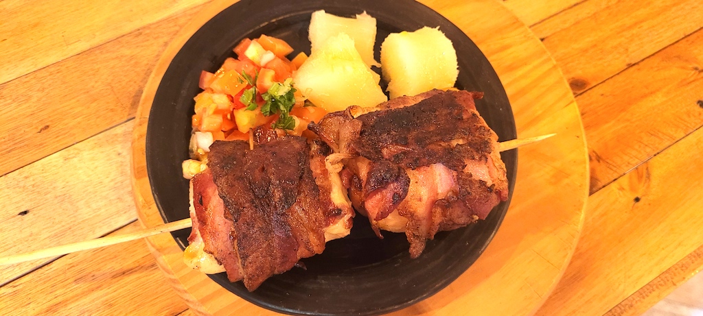 Depois de provar a pamonha doce e salgada recheadas com queijo Minas, e a panelinha de carne seca com tempero goiano, a chef Renata Souza me convidou para conhecer o espetinho, que, na realidade, é um “espetão”: duas bolas gigantes de medalhão de frango com recheio de queijo provolone e envolvido no bacon. É bom não, se amostra! Em Goiás a tradição é churrasquinho grande. Adorei. Então anota: Paladar Goiano (@paladargoianorestaurante), na Rua Paulina Maria de Mendonça, 771 – Jatiúca. Lá tem o famoso arroz com pequi, que amo. Para acompanhar os “churrasquinhos”,você tem a liberdade de escolher, eu apostei na macaxeira e vinagrete. Agora fique ligado, os espetinhos são do cardápio noturno e nos dias de sábado e domingo.