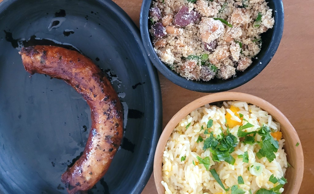 Linguiça suina artesanal com arroz e feijão tropeiro