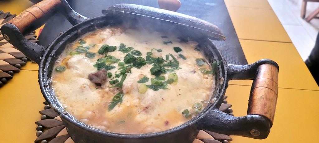 No cardápio tem panelinha de carne, frango, suína… Mas apostei na de carne seca, que é bem interessante. Três pessoas se servem bem. A comida vem lindamente numa panela de ferro com arroz bem molhadinho e envolvido na carne seca, linguiça suína, palmito, milho verde e, para finalizar ,cobertura de mozarela. Muito bom, também.