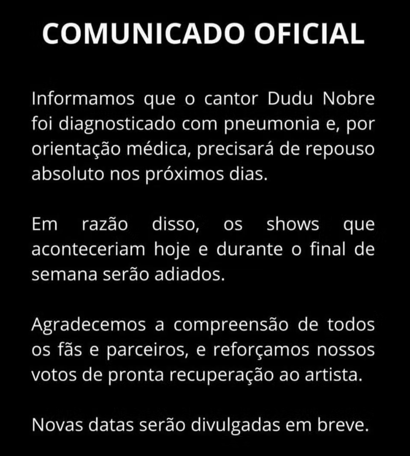 "Informamos que o cantor Dudu Nobre foi diagnosticado com pneumonia e, por orientação médica, precisará de repouso absoluto nos próximos dias. Em razão disso, os shows que aconteceriam hoje e final de semana serão adiados. Novas datas serão divulgadas em breve", disse a assessoria do artista através das redes sociais.