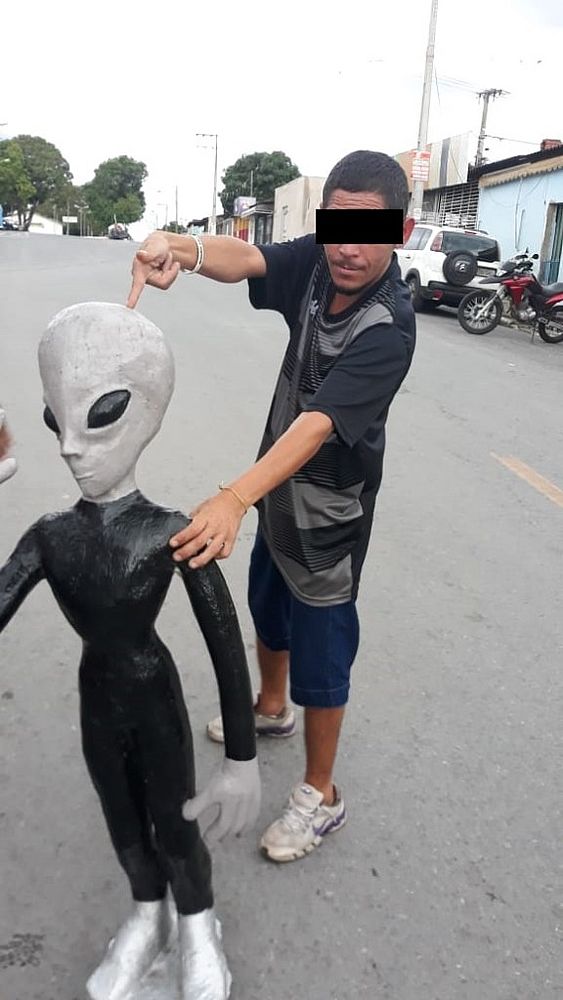 A estátua do extraterrestre furtada na noite de ano-novo, da Casa do Mel, em Chapada dos Guimarães (60 km de Cuiabá), foi encontrada na tarde desta quinta-feira (3), em Cuiabá. Segundo o dono do estabelecimento, Sidarta Spíndola, a Polícia Militar encontrou o ET nas mãos de um homem supostamente alcoolizado, no bairro Santa Isabel.