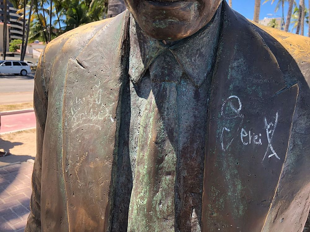 As violências de hoje são pichações feitas na estátua de um dos mais ilustres caminhantes do calçadão de Maceió. Duas delas feitas à tinta e a terceira cravada na lapela do terno do homem que deveria abrilhantar nosso cartão postal como abrilhantou a nossa literatura.