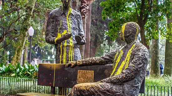 Monumento em homenagem à literatura brasileira, as imagens em bronze surgiram com uma tinta amarela descaracterizando a obra criada pelo artista plástico austríaco Xico Stockinger (1919-2009).