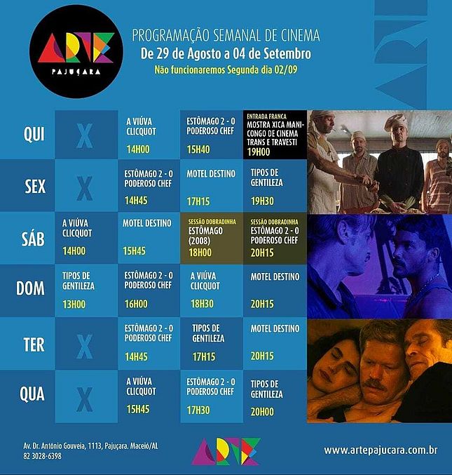 Em Cartaz no Arapiraca Partage Shopping, Centerplex (Shopping Pátio Maceió), Cinesystem (Parque Shopping), Grupo Cine (Shopping da Vila - Delmiro Gouveia) e Kinoplex (Maceió Shopping)