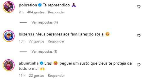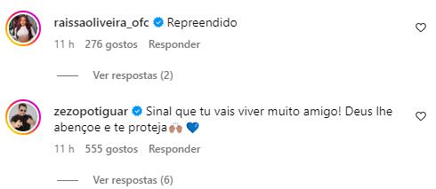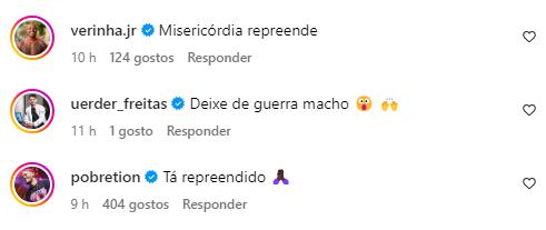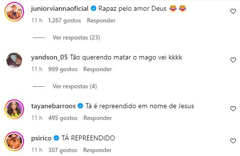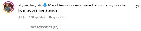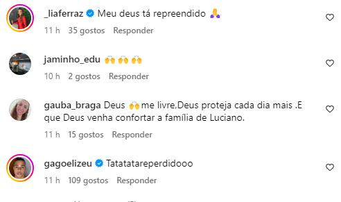 “Sinal que tu vais viver muito amigo! Deus lhe abençoe e te proteja”, disse Zezo. “Tá repreendido”, falou Márcio Victor. “Meu Deus do céu, quase bati o carro, vou te ligar agora, me atenda”, expressou a influenciadora Alyne Lary.