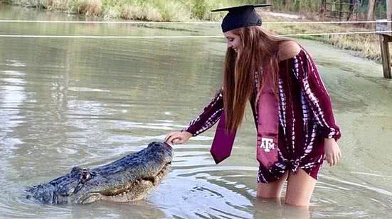 Uma estudante universitária dos EUA garantiu que seu álbum de formatura seja inesquecível. Ela posou para fotos, usando a tradicional faixa e chapéu de formatura, ao lado de um jacaré de quatro metros.
