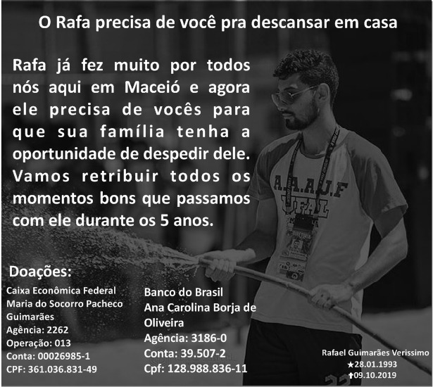 Um estudante do 8º período de medicina da Ufal, Rafael Guimarães Veríssimo, 26, morreu na manhã desta quarta-feira (9), em decorrência de uma parada cardiorrespiratória, durante uma partida de futsal. O jovem era natural de Anápolis e fazia parte de um grupo de atletas do curso, que agora promove uma campanha para arrecadar recursos para o translado do corpo até o estado de Goiás.