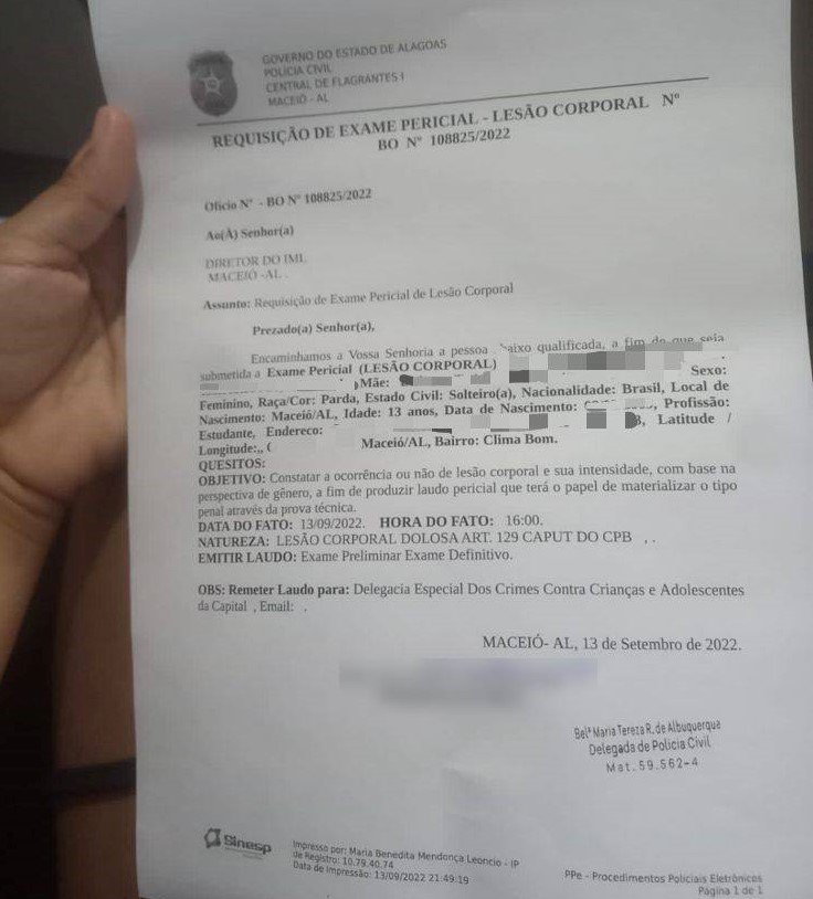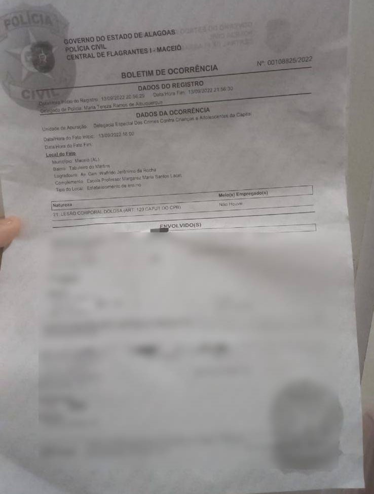 A mãe de uma estudante de 13 anos registrou, nessa terça-feira, 13, boletim de ocorrência por suposta agressão feita por um professor da Escola Estadual Professor Margarez Maria Santos Lacet, no Tabuleiro dos Martins, parte alta de Maceió. A situação aconteceu no período da tarde de ontem e a mãe da aluna foi avisada por uma amiga da adolescente. "Ontem cheguei em casa do trabalho e de repente recebi ligação da amiga da minha filha, que estuda na mesma sala, pedindo pra eu olhar o Whatsapp rapidamente. Quando olhei, vi a foto do braço da minha filha todo vermelho e arranhado. Perguntei o que foi isso, ela disse que foi o professor. Fui na escola e mandei chamar a diretora. A direção em nenhum momento me ligou. Eu disse o que aconteceu, pedi para ela chamar o professor, a diretora disse que não podia chamar e falou para acionar o Conselho Tutelar ou a polícia para registrar boletim de ocorrência", contou a mãe da menina, Tatiane Correia, ao TNH1. A Secretaria de Estado da Educação de Alagoas (Seduc) informou que está acompanhando o caso e já adotou os procedimentos administrativos relativos à denúncia (Leia nota abaixo).