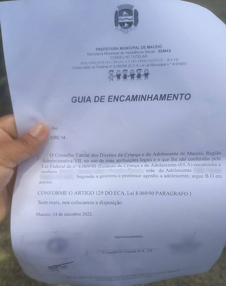 Por meio da assessoria de comunicação, a Secretaria de Estado da Educação de Alagoas (Seduc) informou que está acompanhando o caso e que os procedimentos administrativos relativos à denúncia já estão sendo realizados desde essa terça-feira, 13, incluindo o acolhimento da aluna e de seus responsáveis por parte da gestão escolar. Leia a nota na íntegra.
