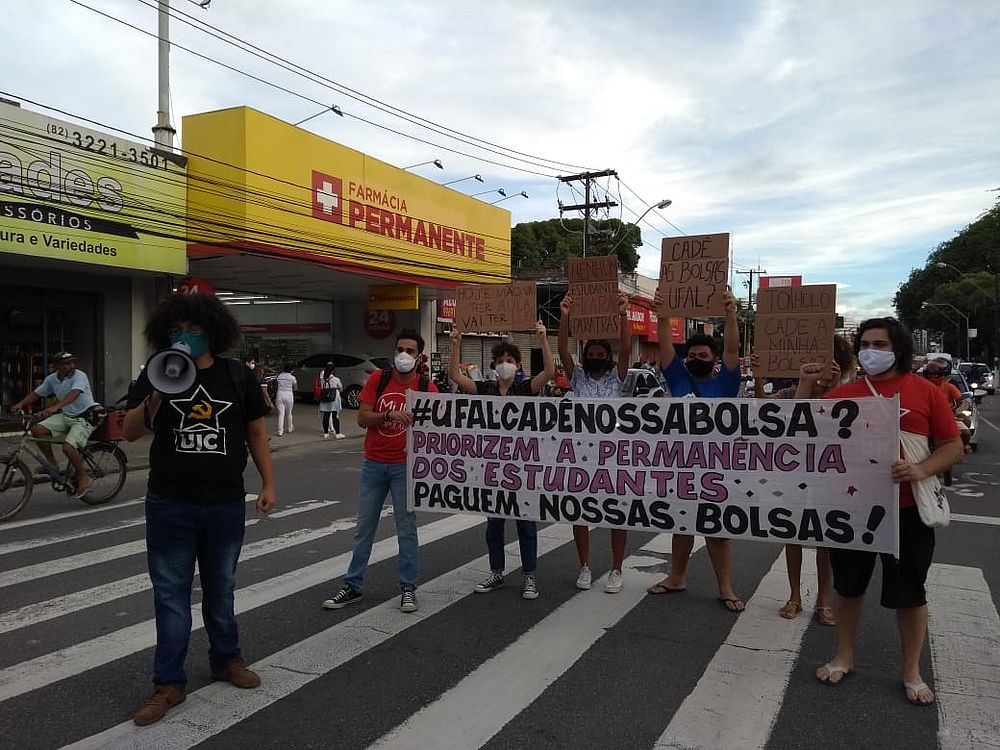 Na capital, o ato foi realizado na Praça do Centenário, no Farol. Em uma faixa, o grupo usou a hashtag 'Ufal, cadê nossa bolsa?' e pediu para a universidade priorizar a permanência dos universitários.
