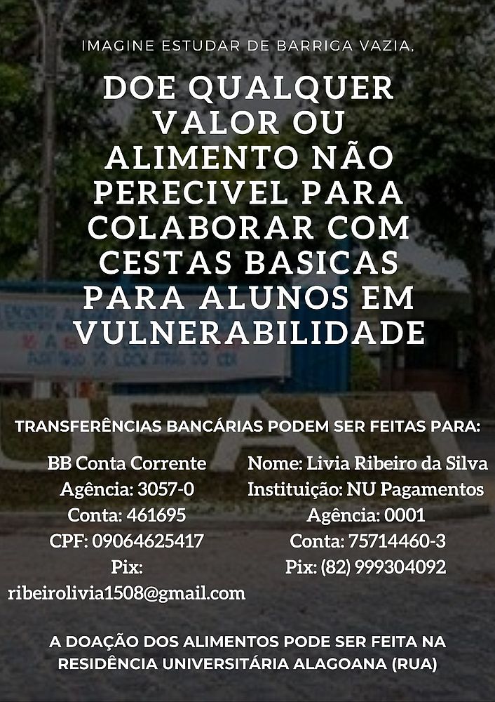 Estudantes da Universidade Federal de Alagoas (UFAL) se mobilizaram para arrecadar fundos para financiar cestas básicas para alunos que ainda não receberam o pagamento dos valores da bolsa estudantil. Segundo o movimento, o repasse do dinheiro está atrasado há cerca de um mês e muitos universitários se encontram em situação de extrema pobreza, com necessidade de ajuda para continuar com os estudos na universidade.