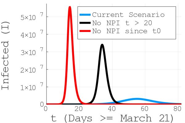 O Google Community Mobility cria relatórios mostrando como está a movimentação das pessoas em determinadas regiões como lojas, supermercados e centros urbanos. Tomando por base o nível de isolamento social do país, o modelo matemático epidemiológico traçou alguns cenários. Um deles é se nada tivesse sido feito, desde o dia 21 de março, uma curva vermelha mostra que o Brasil já teria mais de 50 milhões de pessoas infectadas.
