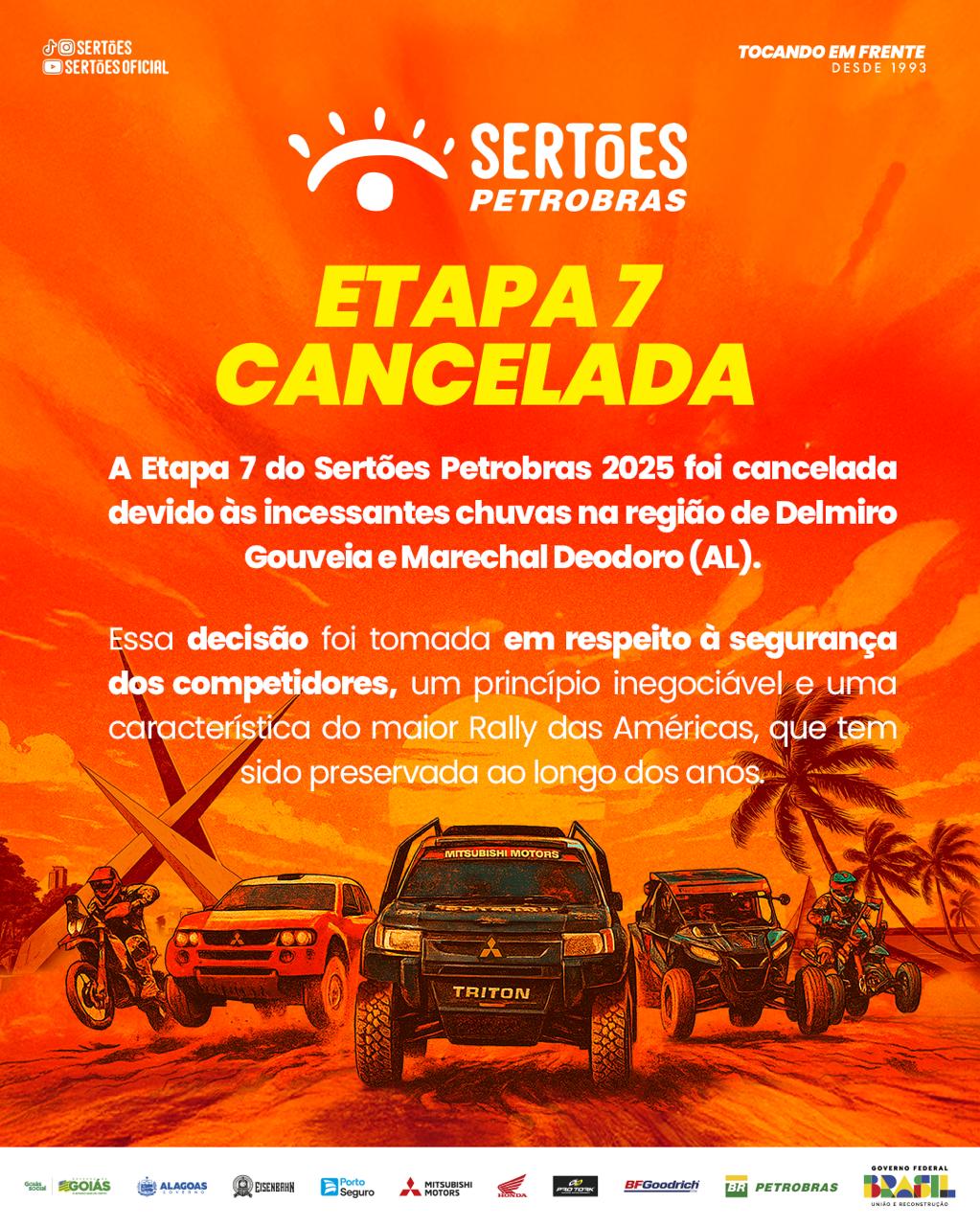 "A Etapa 7 do Sertões Petrobras 2025 foi cancelada devido às incessantes chuvas na região de Delmiro Gouveia e Marechal Deodoro (AL). Essa decisão foi tomada em respeito à segurança dos competidores, um princípio inegociável e uma característica do maior Rally das Américas, que tem sido preservada ao longo dos anos".