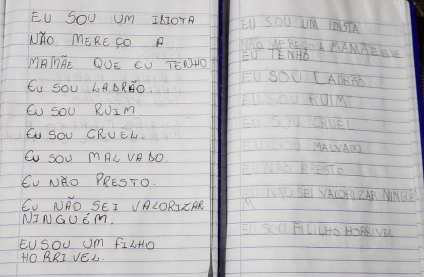No caderno, que foi encontrado em um dos apartamentos onde Miguel morou com a mãe, no Balneário de Santa Terezinha, há frases como "eu sou um idiota", "não mereço a mamãe que eu tenho", "eu sou ladrão", "eu sou ruim" e "eu sou um filho horrível".