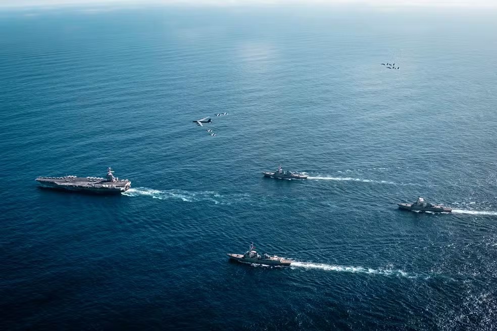 A atuação conjunta com a Força Aérea deixa a presença dos EUA ainda mais intimidante. As imagens divulgadas mostram o grupo de ataque operando junto a um bombardeiro B-52, aeronave capaz de lançar mísseis de longo alcance e realizar patrulhas estratégicas em grande altitude.