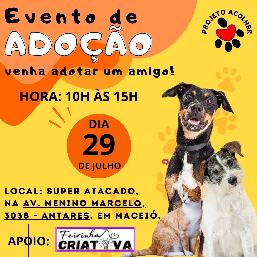 O Projeto Acolher vai participar de um grande evento organizado pela Feirinha Criativa, no dia 29 de julho, das 10h às 15h, no Super Atacado que fica situado na Av. Menino Marcelo, 3038, no bairro do Antares.