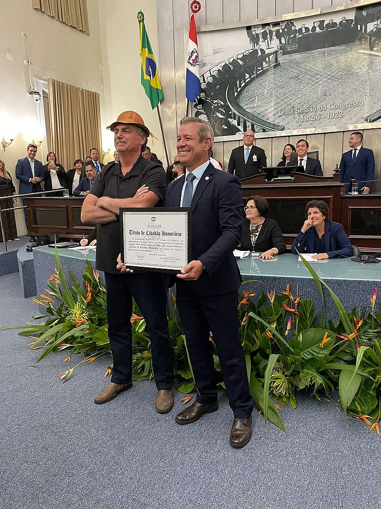 O ex-presidente Jair Bolsonaro (PL) foi agraciado, na tarde desta sexta-feira (5), com o título de Cidadão Honorário do Estado de Alagoas. A homenagem, de autoria do deputado Cabo Bebeto, foi entregue ao ex-presidente na Assembleia Legislativa de Alagoas (ALE). Além de Bolsonaro, a ex-primeira-dama Michelle Bolsonaro (PL) também foi homenageada pela Câmara Municipal de Maceió.