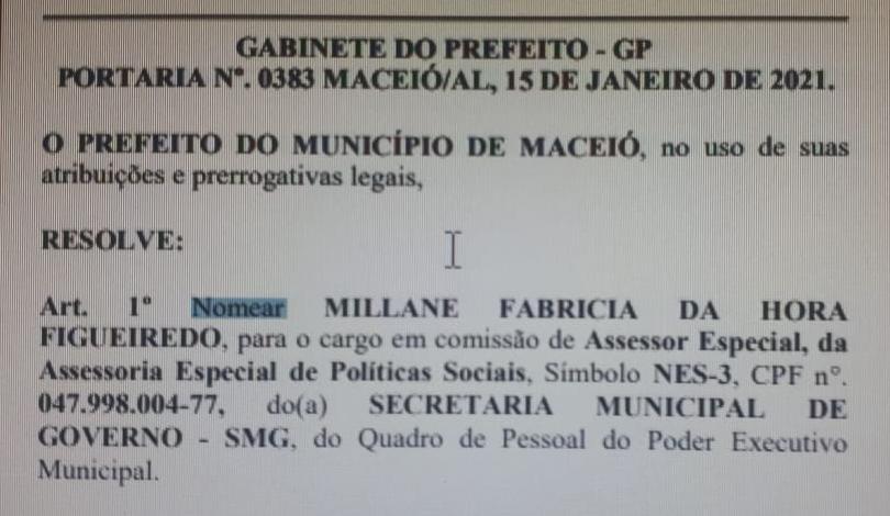 Namorada do senador Rodrigo Cunha, que também é presidente do PSDB em Alagoas, Millane Hora assumiu o cargo comissionado de assessora especial de Políticas Sociais da Prefeitura de Maceió. O cargo tem remuneração de R$ 11 mil.
