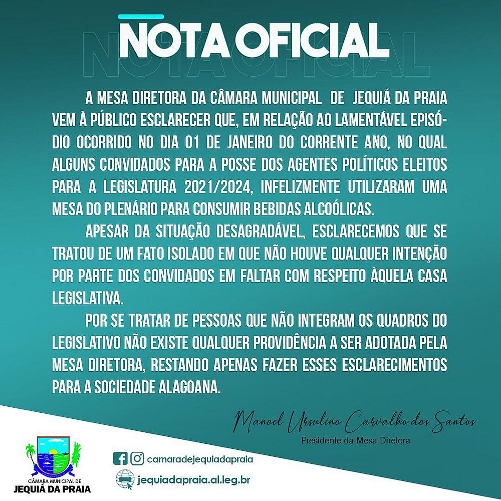 Confira a nota oficial da Câmara de Jequiá de Praia: