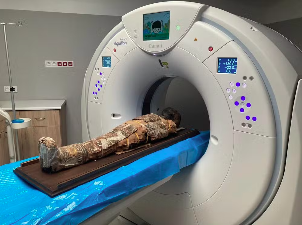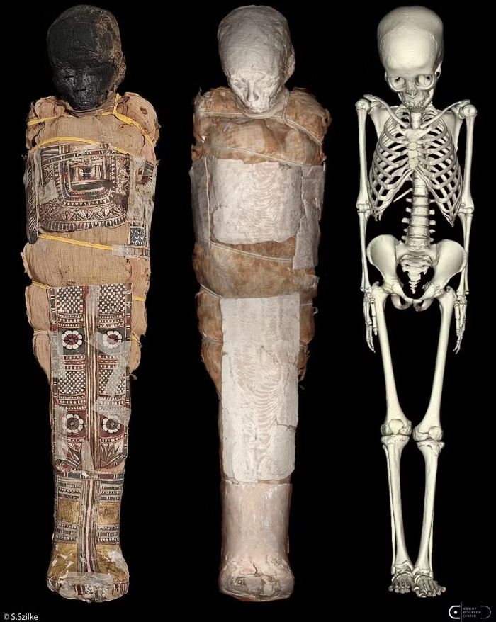 Com o apagamento do registro histórico da múmia na guerra, os pesquisadores precisaram encontrar outras formas de saber informações sobre a origem e a vida do menino. Exames de radiografia, tomografias computadorizadas – que fazem uma varredura no corpo sem danificá-lo e estudos dos tecidos moles preservados – permitiram definir a idade e sexo do corpo, assim como identificar sinais de doenças. Veja abaixo: